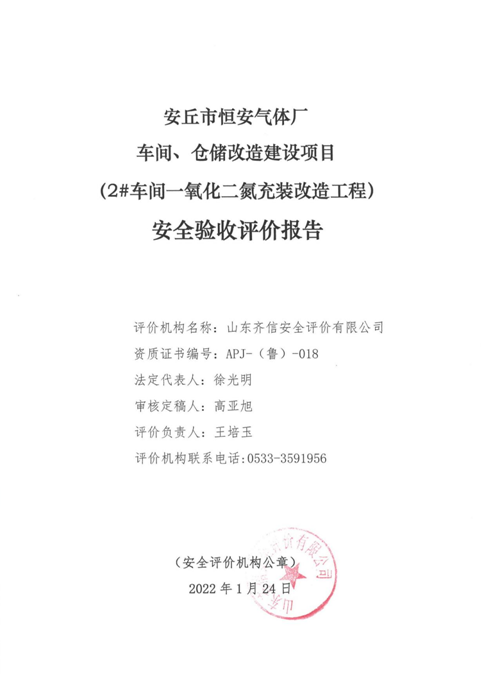 前 言 安丘市恒安气体厂成立于2000年5月29日,注册地址为山东省潍坊市安丘市新安街道新西外环路东侧(陈家楼村东),投资人为刘德军,公司注册资金500万元,为个人独资企业。 该公司经营范围为一般项目:食品添加剂销售;基础化学原料制造(不含危险化学品等许可类化学品的制造) ;专用化学产品制造(不含危险化学品) ;专用化学产品销售(不含危险化学品) ;消防器材销售;安全、消防用金属制品制造;特种设备销售;特种设备出租;金属链条及其他金属制品销售;第一类医疗器械销售;第二类医疗器械销售(除依法须经批准的项目外,凭营业执照依法自主开展经营活动)许可项目;危险化学品生产;危险化学品经营;危险化学品仓储;燃气经营;食品添加剂生产;移动式压力容器/气瓶充装;消防设施工程施工;特种设备制造;特种设备安装改造修理;特种设备检验检测服务;特种设备设计;货物进出口;技术进出口;药品生产;第三类医疗器械经营。 安丘市恒安气体厂现有南北两个厂区,两厂区中间以生产路相隔。该公司氩气、氮气及一氧化二氮充装设施原位于北厂区,目前其充装供应能力已不能满足日益增长的市场需求,充装原址已没有继续扩大的空间,安丘市恒安气体厂为适应市场需求,结合本公司实际情况,于2021年4月在公司南厂区进行车间、仓储改造建设项目(2#车间一氧化二氮充装改造工程),新购置氮气储罐、氩气储罐各1台,均为15m3,新增氮气、氩气充装设施各一套;一氧化二氮储罐1台(利旧),储罐总容积25m?;二氧化碳储罐1台(利旧),容积30m3。2#充装车间(一氧化二氮充装间)改造,厂区北侧新建值班室一处。 |