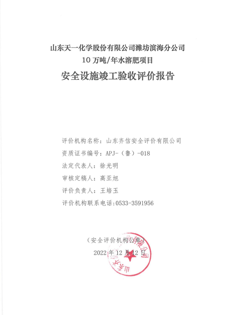 山东天一化学股份有限公司潍坊滨海分公司是山东天一化学股份有限 公司的分公司,成立于2015年11月11日,位于山东省潍坊市滨海区临港工业园润丰路 02266号,负责人为曲文军。经济类型为其他股份有限公司分公司。该公司主要从事生产销售化肥(不含危险化学品);生产销售硝酸钾 50000t/a(有效期限以许可证为准); 生产销售化工产品(不含危险、易制毒产品,在环评允许的范围内经营)。 山东天一化学股份有限公司潍坊滨海分公司厂区内现有 50000 吨/年硝 酸钾生产装置、10000吨/年二苯醚生产装置、1000 吨/年环保型阻燃剂 DOPO 生产装置、1500吨/年二苯乙烷联产 800 吨/年氯化镁生产装置各 1 套。50000吨/年硝酸钾生产装置于2020年3月通过了安全设施竣工验收,于 2020年4月取得安全生产许可证,许可证编号为:(鲁)WH 安许证字〔2020〕070505 号,许可范围为硝酸钾 50000t/a,有效期至2023年4月9日。 山东天一化学股份有限公司潍坊滨海分公司根据自身的发展需要,投资 1000万元在原硝酸钾车间内南侧防火分区建设“10 万吨/年水溶肥项目”。该 项目于2021年9月30日取得山东省建设项目备案证明,建设起止年限为 2022 年至2025年。 该公司10 万吨/年水溶肥项目中的产品为大量元素、中量元素、微量元素水溶肥及腐植酸水溶肥,其中大量元素、中量元素水溶肥中含有的主要成分硝酸钾质量比小于70%,微量元素水溶肥中含有的主要成分硼酸质量比小于70%;该企业于2022年8月16日经应急管理部化学品登记中心进行了产品鉴定,其中中量元素水溶肥的危险性为:“氧化性国体,类别3;严重眼损伤/眼刺激,类别1;生殖毒性,类别2;特异性靶器官毒性-—次接触,类别1;特异性靶器官毒性一反复接触,类别1” 达到了《危险化学品目录 (2015版 )》中危险化学品的确定原则, 中量元素水溶肥鉴定为危险化学品。根据国家安全监管总局办公厅《关于印发危险化学品目录(2015版)实施指南(试行)的通知》安监总厅管三〔2015〕80号中第五、六条的相关要求,该项目中量元素水溶肥应进行危险化学品登记,但不需要办理相关安全行政许可手续。该企业中量元素水溶肥已办理危险化学品登记证。 该公司10万吨/年水溶肥项目原料为磷酸二氢钾、磷酸一铵、硝酸铵钙、尿素、硫酸铵、硝酸钾、硫酸镁、硫酸钠、磷酸镁、钼酸铵、硼酸、螯合铜、螯合锌、鳌合锰、螯合铁。根据《危险化学品安全使用许可适用行业目录(2013年版)》,该项目属于化学原料和化学制品制造;项目使用的原料不涉及列入《危险化学品使用量的数量标准》(2013年版)中的危险化学品,该项目不属于危险化学品达到使用量的建设项目。 山东天一化学股份有限公司潍坊滨海分公司10 万吨/年水溶肥项目为一般化工建设项目。 该项目于2022年2月由山东筑本安全技术咨询有限公司编制完成本项目安全预评价报告,并且已通过评审。由湖南中化恒科工程设计有限公司编制完成了本项目《安全设施设计专篇》,并且已通过评审。2022年5月开工建设,2022年5月底竣工,2022年8月开始试生产,试生产期间装置运行稳定,各项指标达到设计要求。 |