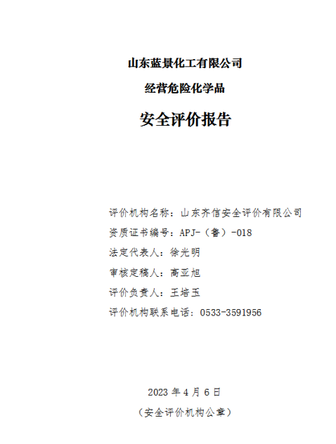 山东蓝景化工有限公司原名为安丘市宏泰经贸有限公司,安丘市宏泰经贸有限公司成立于 2007 年 1 月 15 日,注册地址为安丘市景芝镇汇泉路南首,公司原法定代表人为葛永明。安丘市宏泰经贸有限公司于2017年7月变更为山东蓝景化工有限公司,2018年4月28日取得安丘市市场监督管理局核发的新营业执照,法定代表为李桂秀。该公司是一家危险化学品经营企业。公司现有职工5人,专职安全管理人员1人。 该公司现有11台立式盐酸储罐(6 台 150m3盐酸储罐,5 台 110m3盐酸储罐);1台10m3卧式次氯酸钠溶液储罐,1 台 10m3卧式硫酸储罐,1台10m3卧式氢氧化钠溶液储罐。该公司于2020年6月19 日取得了危险化学品经营许可证,编号:鲁潍危化经[2020]008020 号,有效期至 2023年7月5日。经营范围:有储存设施的经营:盐酸、硫酸、氢氧化钠溶液、次氯酸钠溶液;不带有储存设施的经营:丙酮、醋酸酐、高锰酸钾、甲苯、甲基乙基酮、哌啶、三氯甲烷、乙醚、1,1-二氯乙烷、1,2-二甲苯、1,2-二氯丙烷、1,2-二氯乙烷、1,4-二甲苯、2,2-二甲氧基丙烷、2,4-戊二酮、2-丙醇、2- 甲基-2-丙醇、2-氯丙烯、4-氯甲苯、N,N-二甲基甲酰胺、苯、苯甲醚、苯乙烯、丙酰氯、二甲苯异构体混合物、二聚环戊二烯、二硫化碳、环己酮、环己烷、环氧树脂、甲醇、甲基叔丁基醚、硫代异氰酸甲酯、三乙胺、石油醚、四氢呋喃、松节油、亚硝酸异戊酯、乙醇、乙醇溶液、乙二醇乙醚、乙腈、乙醛、乙酸乙烯酯、乙酸乙酯、异丁酸、异丁烯酸甲酯、正丁醇、正庚烷、正硅酸乙酯、正癸烷、正己烷、1,2-苯二胺、1,3-苯二胺、1,4-苯二胺、1,4-苯二酚、1-萘胺、2-氨基吡啶、2-丁氧基乙醇、2-甲基苯胺、2-羟基苯甲醛、2-硝基苯胺、4-甲基苯胺、4-甲氧基苯胺、4-溴苯胺、苯胺、苯酚、苯甲酸甲酯、苯肼、对甲苯磺酰氯、二氯甲烷、氟化钾、酒石酸锑钾、硫脲、氯化钡、偏钒酸铵、三氯乙烯、四氯化碳、硝酸亚汞、乙酸铅、1,2-乙二胺、1,6-己二胺、2-氨基乙醇、氨基磺酸、氨溶液、苯甲酰氯、丙酸、丙烯酸、丁酸、多聚磷酸、氟硼酸、汞、甲醛溶液、甲酸、邻苯二甲酸酐、硫化钠、硫酸氢钾、氯化亚砜、氯甲酸苄酯、氢氟酸、氢溴酸、氢氧化钾溶液、氢氧化钠、三氟乙酸、三氯化铝、三氯化铁、水合肼、五氧化(二)磷、亚硫酸氢钠、乙酸、乙酸溶液、正磷酸、亚氯酸钠溶液、2,2'-偶氮二异丁腈、甲醇钠、金属钾、金属钠、连二亚硫酸钠、硫磺、硫氢化钠、镁粉、萘、锌粉、4,6-二硝基-2-氨基苯酚钠、氮、二氧化硫、二氧化碳、一甲铵、乙烷、碘酸钾、高碘酸钠、高锰酸钠、过氧化(二)苯甲酰、过氧化二叔丁基、过氧化二异丙苯、过氧化氢、过氧化氢叔丁基 、过氧化氢异丙苯、过乙酸、三氧化铬、硝酸胍、硝酸锰、溴酸钾、亚硝酸钠、重铬酸钾、亚氯酸钠、氯酸钠、氯酸钠溶液。销售:化工产品(不含危险化学品)、食品添加剂、环境保护专用设备、玻璃钢制品、职业清新服务、建筑物内清洁服务、货物运输代理、装卸搬运、仓储服务、信息技术咨询服务。 |