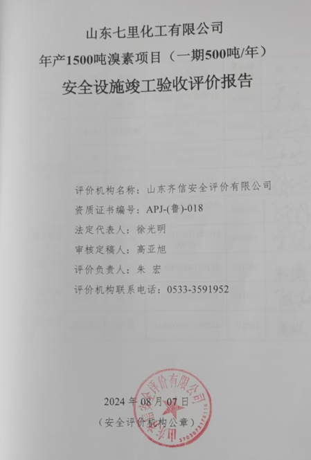 山东七里化工有限公司成立于2021年04月29日,注册地位于山东省潍坊市滨海区大家洼街道七里村村委大院内,法定代表人为王兆强。经营范围包括一般项目:化工产品生产(不含许可类化工产品);化工产品销售(不含许可类化工产品);机械设备销售;机械零件、零部件销售;五金产品零售;建筑材料销售;橡胶制品销售;金属结构销售;电线、电缆经营;办公设备销售;建筑用金属配件销售;电力设施器材销售。公司主要负责人为李卓恩,该公司劳动定员18人,其中管理人员10人,操作人员8人,主要从事溴素的生产和销售。 山东七里化工有限公司原名潍坊天成化工有限公司,潍坊天成化工有限公司由潍坊滨海经济开发区大家洼街道七里村民委员会发起成立,该村溴素厂始建于2002年,之后对外承包给潍坊仟祥巨化工有限公司运营(年产量750t/a),后来按照全体村民的意愿,不再对外承包经营,经营权回收后以潍坊天成化工有限公司的名义进行运营,经反复论证和考察,原决定在原有生产装置原址建设年产1500吨溴素项目,本项目为一期工程年产溴素500吨。 2022年6月9日,潍坊天成化工有限公司公司更名为山东七里化工有限公司,并取得了潍坊滨海经济开发区行政审批服务局出具的企业变更情况证明。 该项目的《设立安全评价报告》由山东应急安全技术服务有限公司编制,于2022年3月22日取得《危险化学品建设项目安全审查意见书》:潍应急危化品项目审字[2022]0023号;《安全设施设计专篇》由山东富海石化工程有限公司编制,于2022年05月05日取得《危险化学品建设项目安全审查意见书》:潍应急危化项目审字[2022]0034号;该公司委托山东博泰特安全技术有限公司对该项目进行了试生产条件安全评价,于2023年04月编制完成《山东七里化工有限公司年产1500吨溴素项目(一期500吨/年)试生产条件安全评价报告》,并于2023年8月13日开始试生产,试生产期间生产装置运行平稳,试运行正常,工艺、设备安全、可靠,产品达到质量标准。 根据《重点监管危险化学品名录》(2013年完整版),该项目涉及的重点监管危险化学品有氯、二氧化硫;根据《危险化学品目录》(2015版,2022年调整),该项目涉及剧毒化学品氯。 根据《重点监管危险化工工艺目录》(2013年完整版)进行辨识,该项目不涉及重点监管的危险化工工艺。 根据《危险化学品重大危险源辨识》(GB18218-2018),经辨识、计算,该公司溴素罐区构成四级危险化学品重大危险源,液氯库构成三级危险化学品重大危险源。 按照《中华人民共和国安全生产法》、《危险化学品建设项目安全监督管理办法》等法律、法规、文件的规定要求,山东七里化工有限公司委托我公司进行安全设施竣工验收评价。 接受委托后,本公司成立了评价组,立即展开工作。在对该项目进行现场勘察、同行业类比分析和查阅企业提供的评价相关资料的基础上,通过定性、定量分析评价,找出了该项目存在的问题,提出了相应的安全对策措施及建议,给出了安全设施竣工验收评价结论,根据《安全评价通则》(AQ8001-2007)、《安全验收评价导则》(AQ8003-2007)、《关于印发<危险化学品生产建设项目安全风险防控指南(试行)>的通知》(应急〔2022〕52号)以及其它相关的法规、标准、文件,对项目可能存在的危险和有害因素进行了识别与分析,针对识别出的危险和有害因素运用多种评价方法进行了定性定量评价,进而提出了安全对策措施及建议,在此基础上编制完成了本验收评价报告。 |
