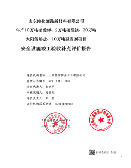 山东海化骊潍新材料有限公司(以下简称“该公司”)成立于2023年03月31日,注册地位于山东省潍坊市滨海区大家洼街道化工街01081号,法定代表人为孙仿建。经营范围包括一般项目:化工产品销售(不含许可类化工产品);化工产品生产(不含许可类化工产品);饲料添加剂销售;非食用盐加工;非食用盐销售;肥料销售;化肥销售。(除依法须经批准的项目外,凭营业执照依法自主开展经营活动)许可项目:饲料添加剂生产;肥料生产。(依法须经批准的项目,经相关部门批准后方可开展经营活动,具体经营项目以相关部门批准文件或许可证件为准)。 山东海化骊潍新材料有限公司由山东海化股份有限公司和山东裕滨新材料有限公司合资成立,原山东海化股份有限公司硫酸钾厂固定资产及土地由山东海化骊潍新材料有限公司继承。山东海化骊潍新材料有限公司厂内现建设有年产2万吨硫酸钾生产装置1套(硫酸钾生产装置所在厂区以下简称“东厂区”)。 为增强企业市场竞争能力,山东海化骊潍新材料有限公司投资38000万元建设年产10万吨硝酸钾、2万吨硝酸镁、20万吨太阳能熔盐、10万吨融雪剂项目(以下简称“该项目”)。该项目位于山东海化骊潍新材料有限公司厂区西侧新购置土地建设(该项目所在厂区以下简称“西厂区”,东、西厂区间设置围墙)。 该项目于2024年3月27日取得山东省建设项目备案证明,项目代码:2403-370700-89-05-568469,于2024年6月开工建设,该项目硝酸钾联产氯化镁装置、硝酸镁装置、融雪剂装置于2024年10月建设完成,该项目太阳能熔盐装置于2025年3月建设完成。 该项目为新建项目,项目产品硝酸钾、六水合硝酸镁、太阳能熔盐均为危险化学品,因此,该项目属于新建危险化学品生产项目。 该公司委托山东开元工程技术有公司对该项目进行了试生产条件安全评价,根据项目的建设进度分一期、二期进行试生产,该项目硝酸钾联产氯化镁装置、硝酸镁装置、融雪剂装置于2024年11月3日组织专家进行了试生产方案和试生产条件审查,根据试生产安全条件现场审查意见整改后审查通过,于2024年11月编制完成《山东海化骊潍新材料有限公司年产10万吨硝酸钾、2万吨硝酸镁、20万吨太阳能熔盐、10万吨融雪剂项目(一期)试生产条件安全评价报告》,并于2024年11月26日开始试生产;该项目太阳能熔盐装置于2025年3月12日组织专家进行了试生产方案和试生产条件审查,根据试生产安全条件现场审查意见整改后审查通过,于2025年3月编制完成《山东海化骊潍新材料有限公司年产10万吨硝酸钾、2万吨硝酸镁、20万吨太阳能熔盐、10万吨融雪剂项目(二期)试生产条件安全评价报告》,并于2025年03月16日开始试生产。该项目试生产期间生产装置运行平稳,试运行正常,工艺、设备安全、可靠。 该项目不涉及重点监管危险化工工艺,且已试生产满30天,按照《中华人民共和国安全生产法》、《危险化学品安全管理条例》、《危险化学品建设项目安全监督管理办法》、《危险化学品生产建设项目安全风险防控指南(试行)》等法律、法规、文件的规定要求,在建设项目竣工验收前、试生产运行正常后,应对建设项目的设备、设施、装置实际运行状况及管理状况进行评价,为建设项目安全验收提供依据。为此,山东海化骊潍新材料有限公司委托山东oety欧亿体育安全评价有限公司对其年产10万吨硝酸钾、2万吨硝酸镁、20万吨太阳能熔盐、10万吨融雪剂项目进行安全设施竣工验收评价。 我公司接受委托后,立即成立了由专业评价师组成的评价小组,依据安全设施竣工验收评价的工作程序,在对该项目相关资料充分了解和分析的基础上,根据安全设施竣工验收评价工作的有关要求,编制了安全设施竣工验收评价工作计划书,并结合该项目的特点,编制了安全设施竣工验收评价检查表,进行了现场调研,对该项目的安全措施及设施进行了检查,通过对该项目相关资料的汇总、分析和处理,进行了安全设施竣工验收评价,并编制完成了安全设施竣工验收评价报告书。 |