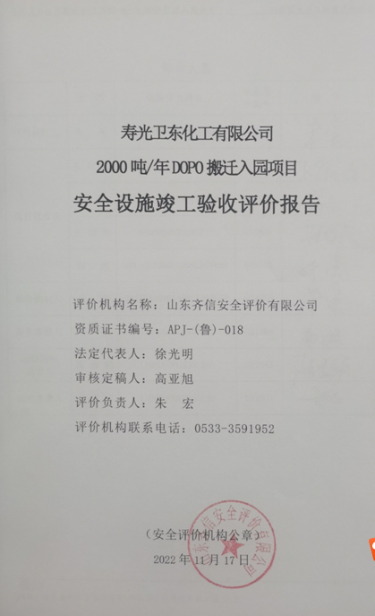 寿光卫东化工有限公司始建于1956年,是一家集科研、生产、加工、销售于一体的大型综合性化工企业。公司地处莱州湾畔、寿光北部,环抱海滨重镇——羊口镇,占地面积20km2,注册资本5000万元,拥有员工1500余人,下辖十三部一室,四个化工基地,五个制盐工区。属省级高新技术企业,为国内的阻燃剂开发生产基地、中国海洋化工产业基地和国家卤水资源综合利用示范基地。 因“退城入园”的要求,寿光卫东化工有限公司现将2000t/aDOPO阻燃剂项目搬入化工园区内,位于寿光市羊口化工产业园,汉江路以东,黄海东路以南,为新建厂区(寿光卫东化工有限公司化工二厂)。产品DOPO、OPP生产规模没变,主要生产工艺没变,副产品盐酸提高了回收技术,产量由2702.4吨提高为3290吨。 该项目于2020年5月由山东瑞康安全评价有限公司编制了安全预评价报告,于2020年10月由山东科达化工工程有限公司编制了安全设施设计专篇并出具了施工图,工程施工安装由山东四方安装工程有限公司负责,监理由青岛华鹏工程咨询集团有限公司承担,项目建设完成后由设计单位、施工单位、监理单位、建设单位四方签署了建设工程交工验收报告,并由东营开元安全评价有限责任公司编制了试生产条件安全评价报告,目前处于试生产阶段。 根据《危险化学品目录(2015版)》,该项目中间产品OPP(邻苯基苯酚)、副产品盐酸属于危险化学品,因此该项目属于新建危险化学品生产项目。根据《中华人民共和国安全生产法》、《危险化学品安全管理条例》、《山东省安全生产条例》、《危险化学品建设项目安全监督管理办法》等法律法规要求,该项目建设完成后应进行安全设施竣工验收评价。 受寿光卫东化工有限公司委托,山东oety欧亿体育安全评价有限公司承担了该公司2000吨/年DOPO搬迁入园项目的安全设施竣工验收评价。双方签定《安全评价技术服务合同》后,山东oety欧亿体育安全评价有限公司确定项目负责人,成立评价项目组,根据国家有关安全生产法律法规、行政规章及标准规范要求,通过对企业提供的资料进行分析和现场检查,结合其生产的实际情况,运用科学的评价方法进行定性、定量分析,提出合理、可行的安全对策措施及建议,并按照《安全验收评价导则》(AQ8003-2007)、《危险化学品建设项目安全评价细则(试行)》(安监总危化[2007]255号)和有关法规、技术标准、文件的规定与要求编制完成了本评价报告。寿光卫东化工有限公司应对提供资料的真实性负全部责任。 |