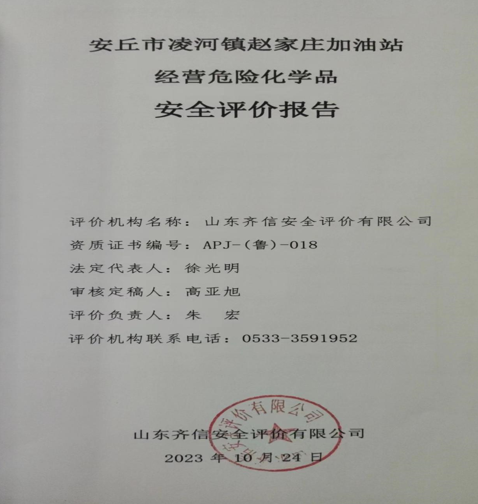 接受委托后,山东oety欧亿体育安全评价有限公司成立评价组,在进行资料与标准收集、现场调研、项目资料分析、危险与有害因素分析的基础上,依据《安全评价通则》(AQ8001-2007)、《山东省加油站安全评价导则》(鲁安监发〔2006114号),通过对该加油站安全管理、站址选择及总平面布置、加油工艺及设施、其他设施等方面的审查,选择相应的评价方法对其危险、有害因素进行辨识和评价,编写完成了《安丘市凌河镇赵家庄加油站安全评价报告》。