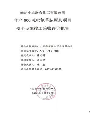 潍坊中农联合化工有限公司年产800吨吡氟草胺项目安全设施竣工验收评价报告