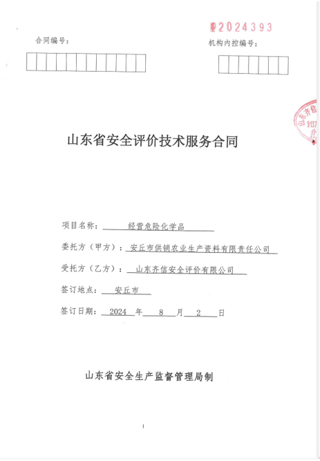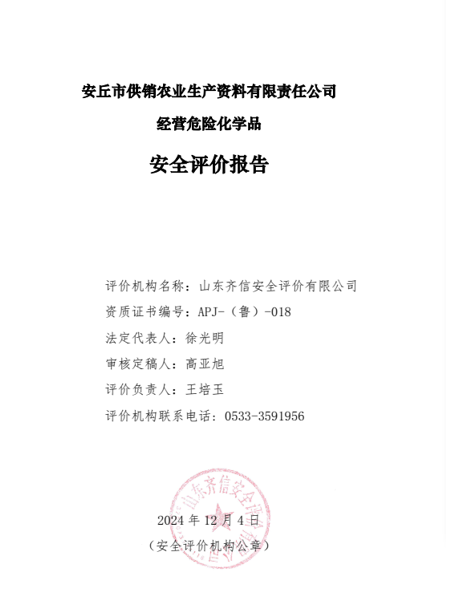 安丘市供销农业生产资料有限责任公司成立于2005年04月01日,2024年06月12日取得由安丘市行政审批服务局核发的新营业执照。公司注册资本叁佰零陆万元整,注册地址为山东省潍坊市安丘市四海村北侧(下小路南侧),法定代表人为臧日姣。该公司是一家危险化学品经营企业,公司现有职工9人,其中安全管理人员1人。 安丘市供销农业生产资料有限责任公司于2021年12月31日取得危险化学品经营许可证,有效期至2024年12月30日,危险化学品经营许可证编号:鲁潍危化经[2021]008002号。许可范围:有储存设施的经营:三氯硝基甲烷;不带有储存设施的经营:二硫化二甲基、1,1’-二甲基-4,4’-联吡啶阳离子、N-(2,6-二乙基苯基)-N-甲氧基甲基-氯乙酰胺、双(N,N-二甲基甲硫酰)二硫化物、(RS)-a-氰基-3-苯氧基苄基(SR)-3-(2,2-二氯乙烯基)-2,2-二甲基环丙烷羧酸酯、溴甲烷和二溴乙烷液体混合物(有效期限以许可证为准) 该企业危险化学品经营许可证即将到期,需延期换发危险化学品经营许可证。依据《危险化学品经营许可证管理办法》(国家安监总局令第55号,根据2015年5月27日国家安全监管总局令第79号修正)等法律、法规、文件的要求,需要按照相关法律法规的要求进行安全评价,为此安丘市供销农业生产资料有限责任公司委托山东oety欧亿体育安全评价有限公司对其进行经营危险化学品安全评价。 |